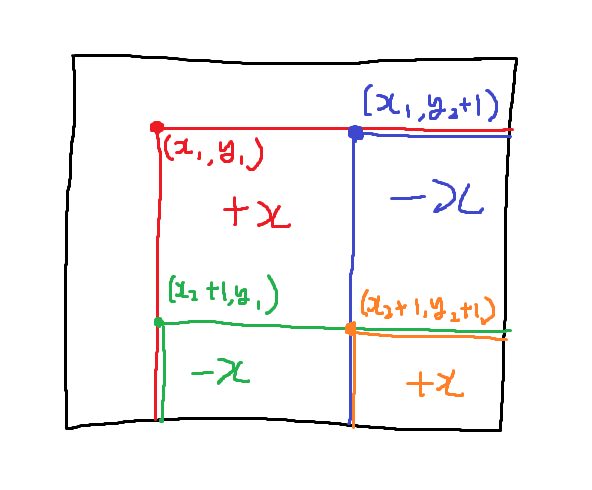그러면 \((x_1, y_1)\) ~ \((x_2, y_2)\)의 직사각형 영역에 \(X\)를 더하는 연산은,