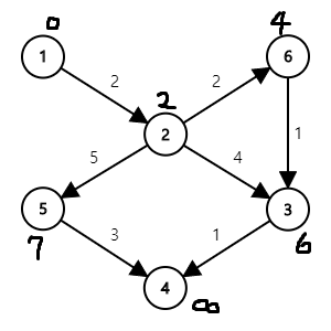 마지막으로 간선 \((3,4)\)를 이용해 4번 정점까지의 거리가 6으로 갱신됩니다.