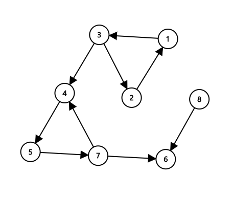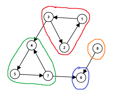 Strongly Connected Component (SCC)는 방향 그래프에서, 다음 조건을 만족하는 정점의 부분집합을 말합니다.