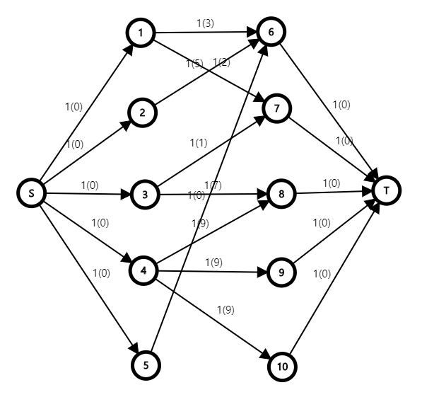 문제를 다음과 같은 그래프에서의 MCMF문제로 생각하고 풀 수 있습니다.